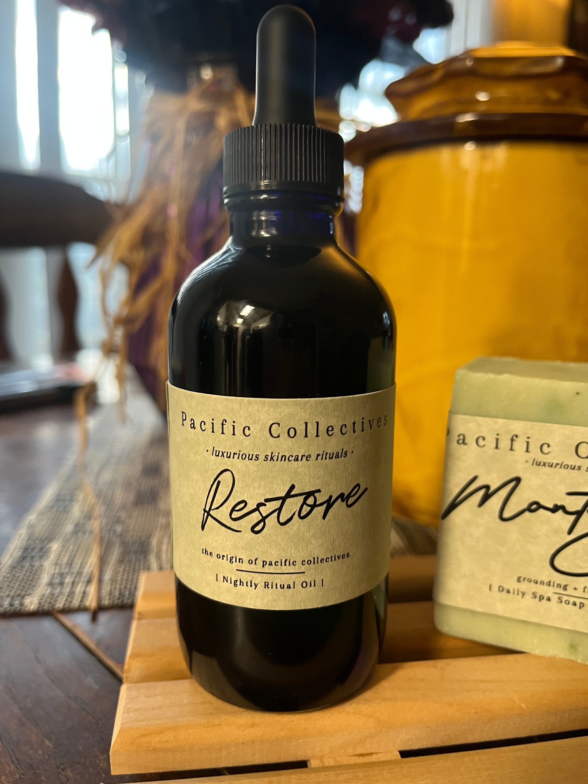 • Restore Facial Oil for a fresh, radiant glow. Jojoba & castor oil, frankincense and vitamin e.